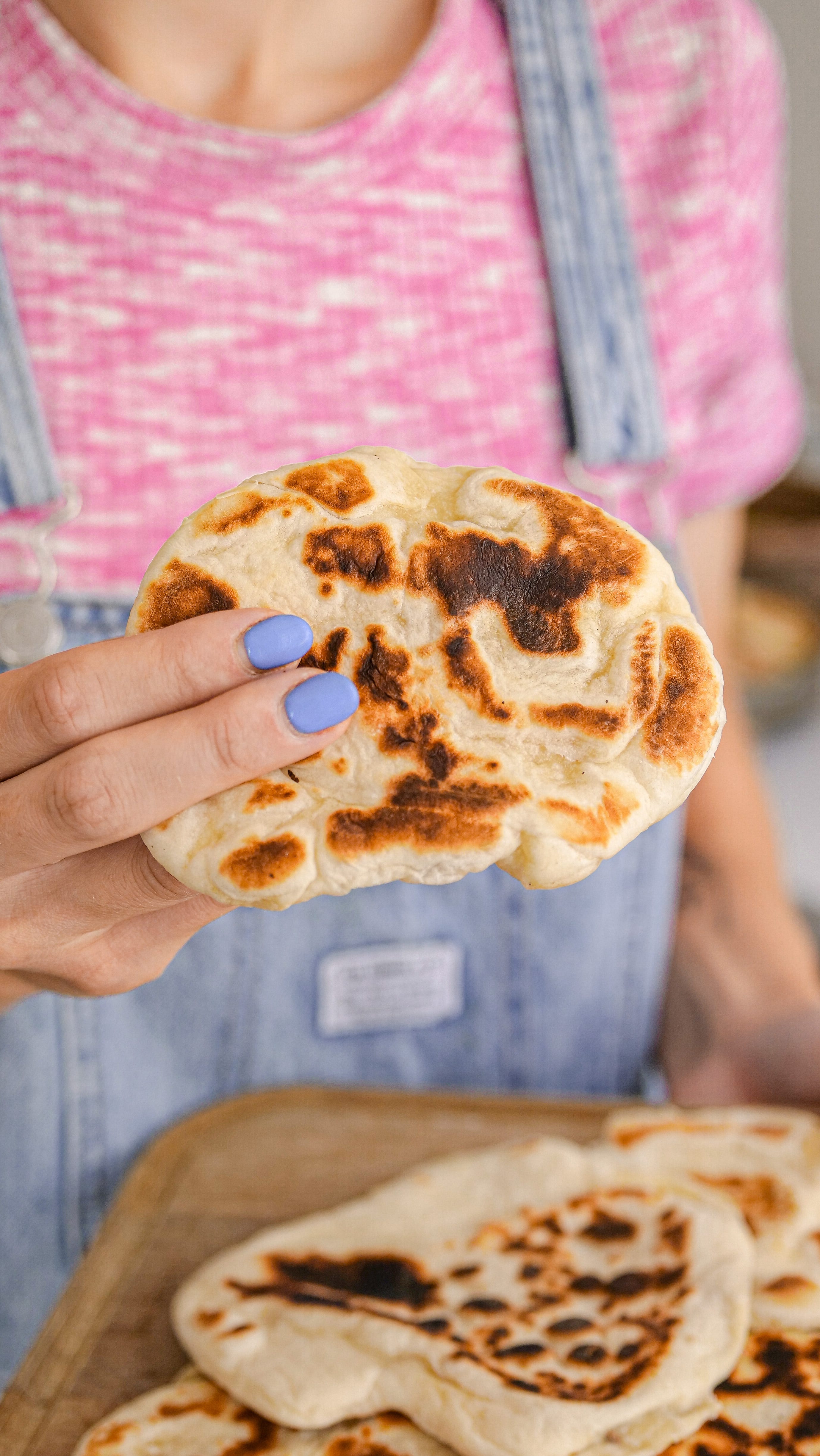 Dans une poêle huilée, déposez les naans et faites-les cuire 2 minutes de chaque côté.